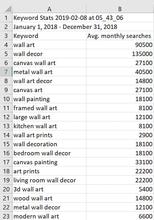 On the data results page, click on the filter in blue that says “Show broadly related ideas” and change it to “closely related.” Broad is very broad — for our example of wall art, you’ll see results such as wallpaper and paint. Choosing “closely related” should filter those less-relevant keywords out of your data set.