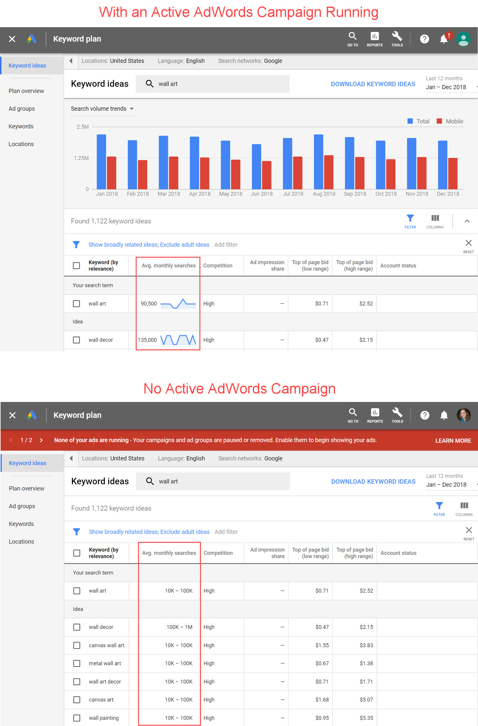 The top screenshot from Google Keyword Planner is without active AdWords campaigns. The lower screenshot shows results with active campaigns. Click image to enlarge.