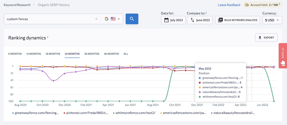 The result is a graph of URLs in the top 10 results for a given query and timeframe — from 6 to 36 months or “All,” which displays the tool’s entire historical dataset for the keyword. Experiment with timeframes until you see a page that entered the top 10 seemingly out of nowhere.