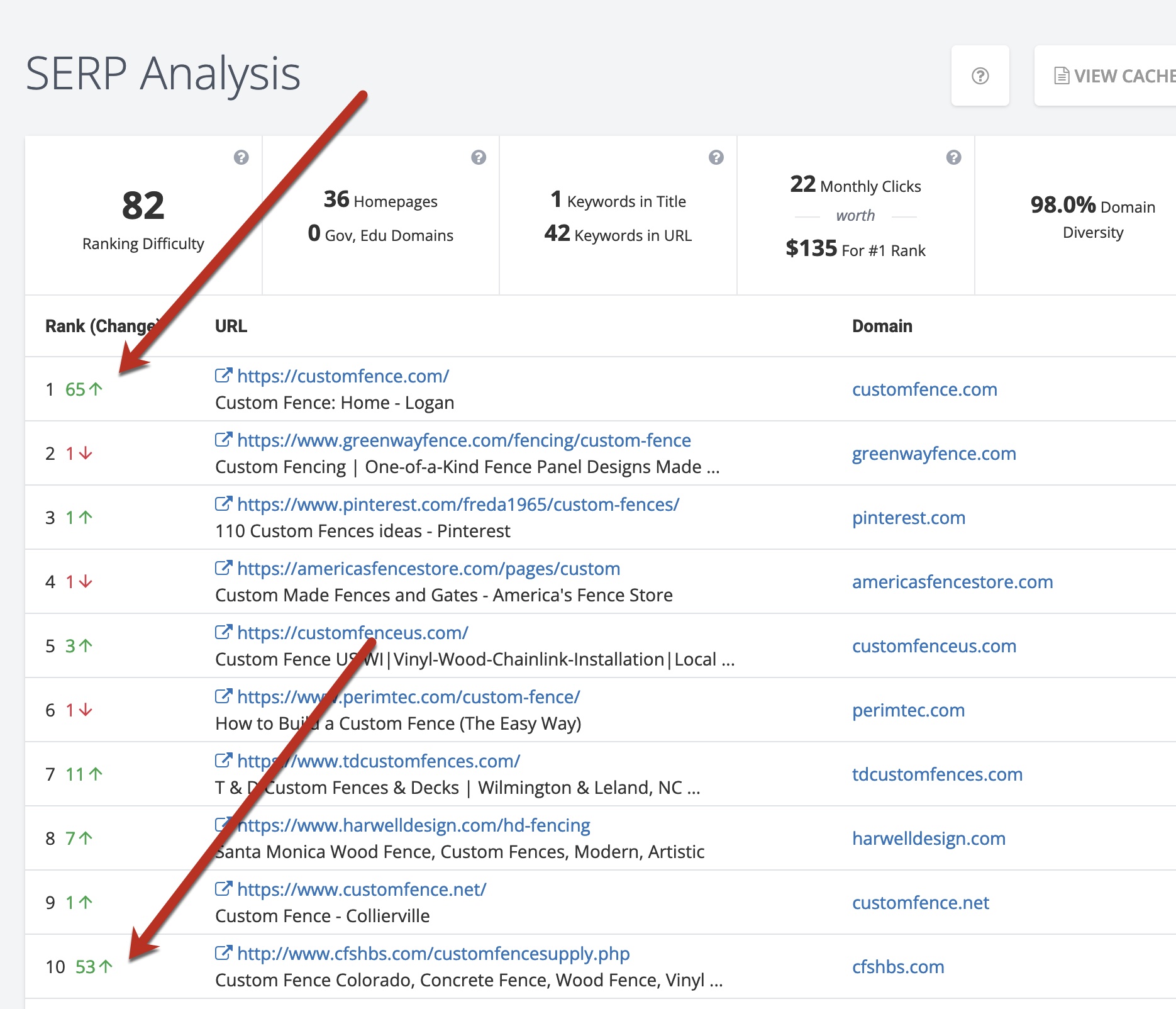 SpyFu shows URLs that gained or lost positions over a specified timeframe for a given keyword. Click image to enlarge.