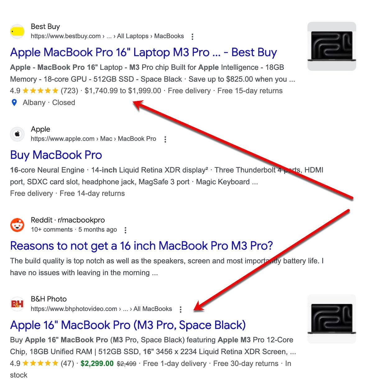 For a search of “apple macbook pro 16 m3,” Best Buy’s structured data shows prices from “$1,740.99 to $1,999.00,” while B&H Photo includes “Free 1-day delivery.”