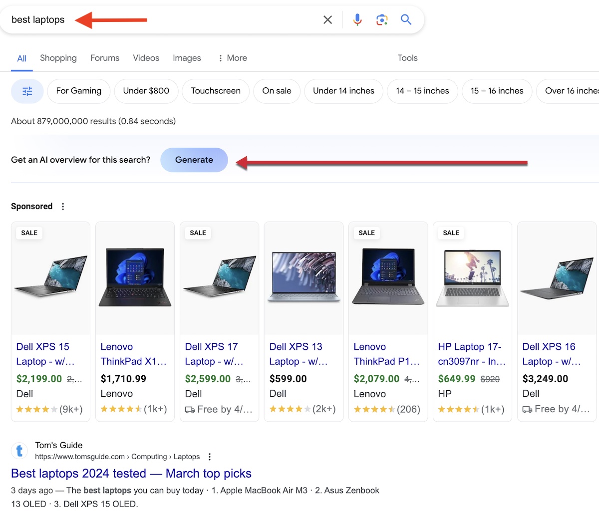 First, the results could contain a “Generate” button that produces an AI-powered answer only when clicked, such as this query of “best laptops.”