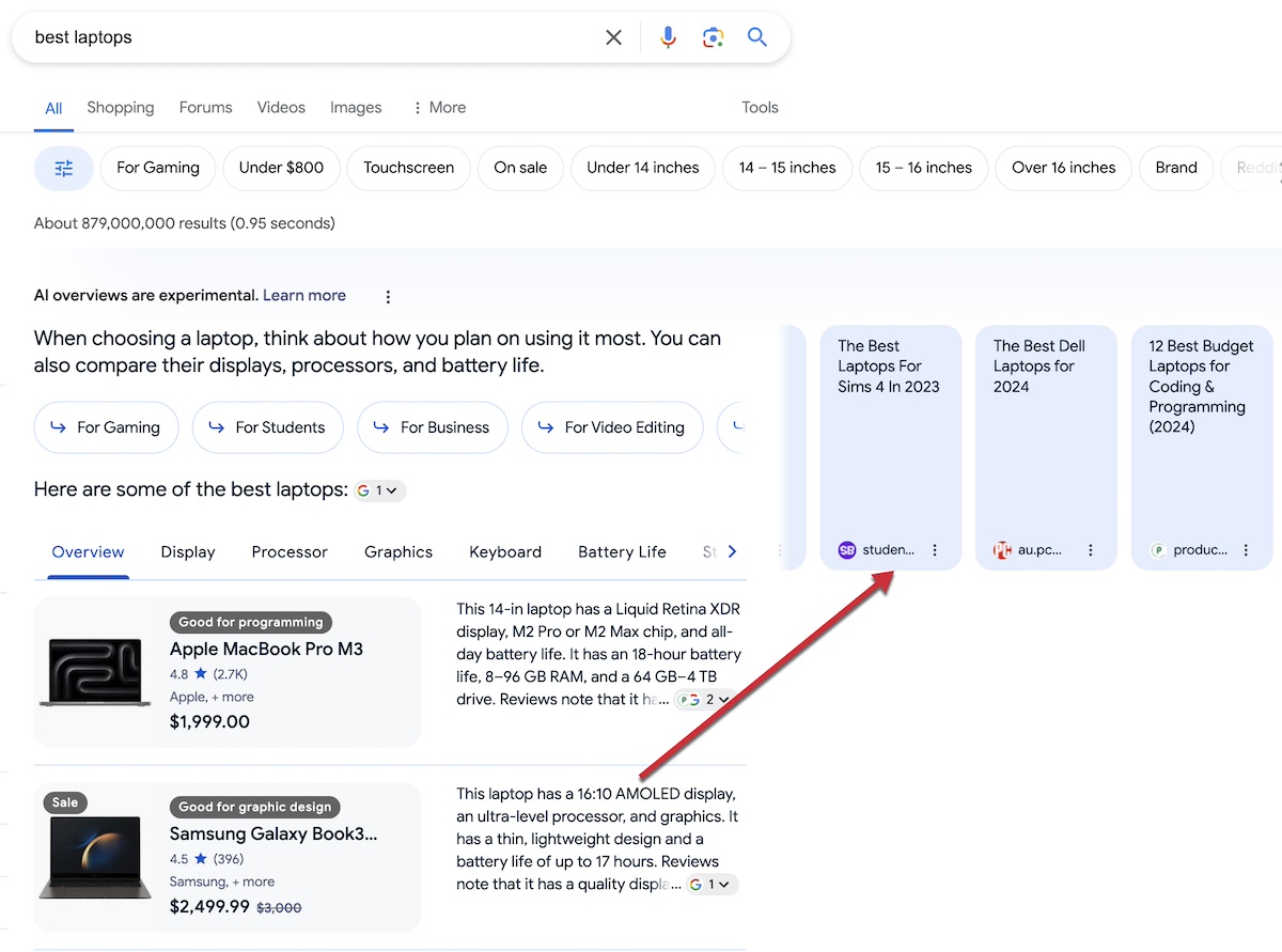 For example, SGE snapshots for the search of “best laptops” list many makes and models as well as links for the best laptops for students, budgets, and coding. Organic listings for “best laptops” do not include those additional choices.