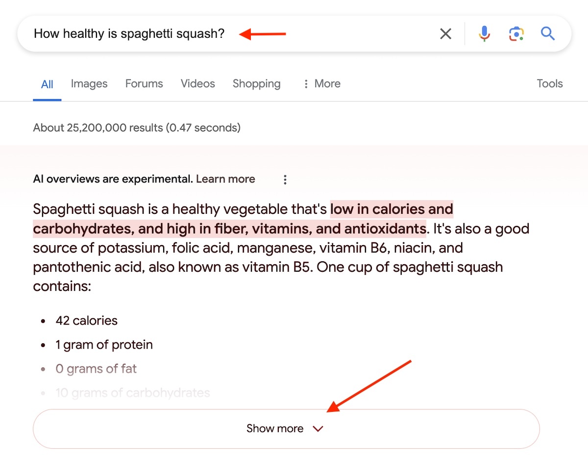Second, the search results could produce an instant answer, such as the example below for “How healthy is spaghetti squash?” Clicking “Show more” expands the explanation.