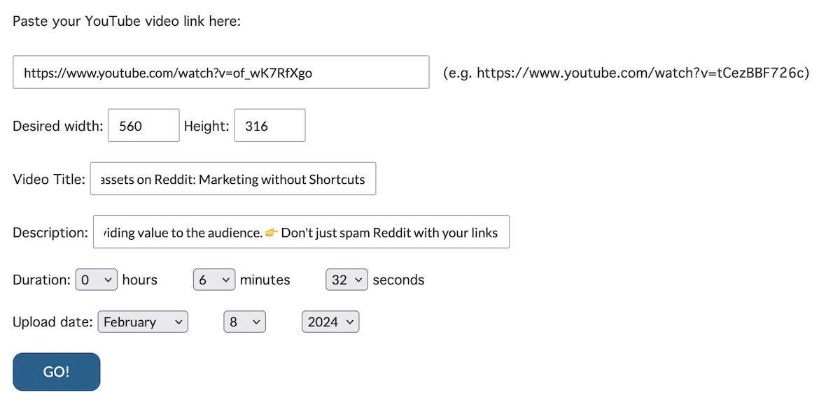 The embed code doesn’t load until the image is clicked, preventing slow page speeds. The tool also includes structured data markup for the Google rich snippet.