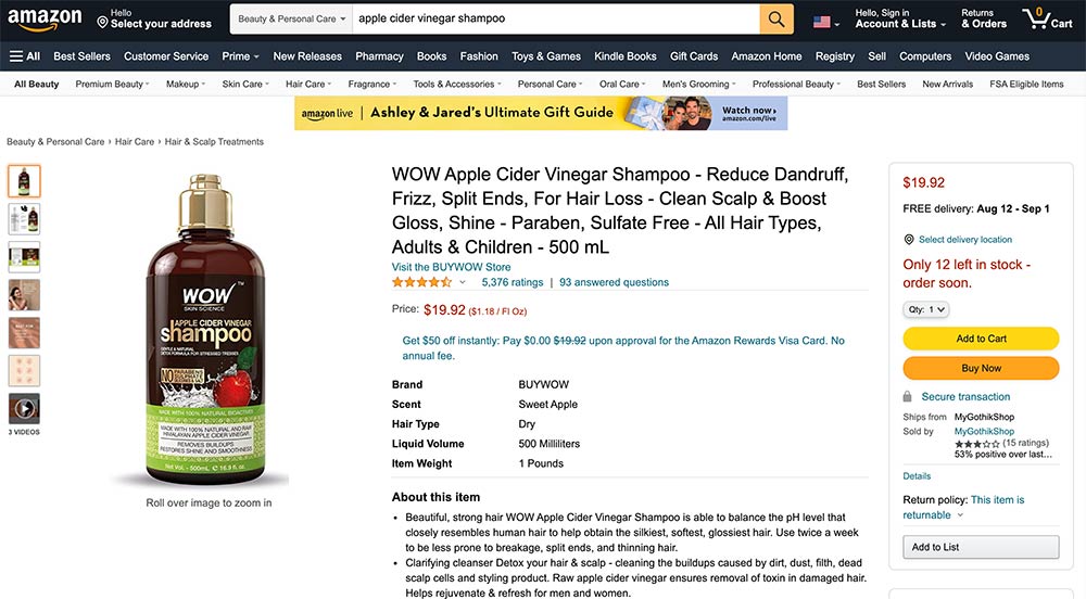 On Amazon, the Wow Apple Cider Vinegar Shampoo page contains content aimed at consumers earlier in their shopping journey.
