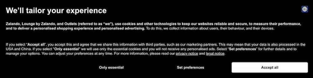 Berlin-based Zalando, a fashion retailer and marketplace, lets visitors control their cookie settings.