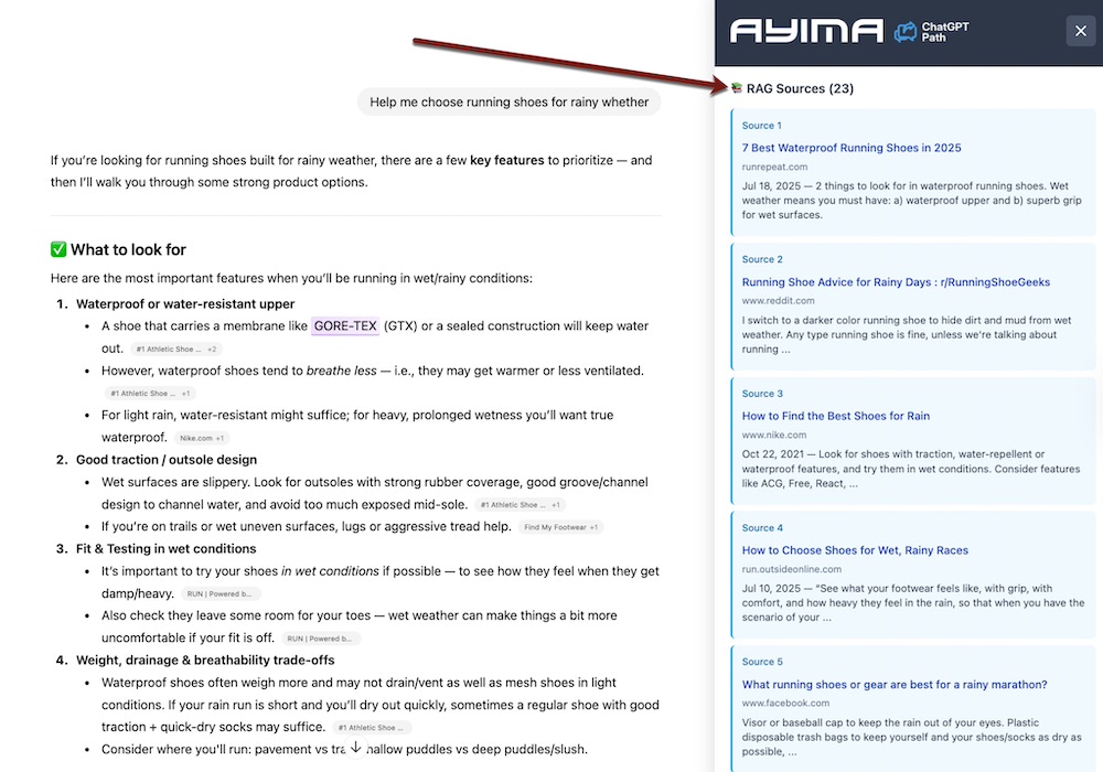 ChatGPT Path extracts citations, brands and products, and fan-out queries from any ChatGPT dialog, such as this example for “help me choose running shoes for rainy weather.”