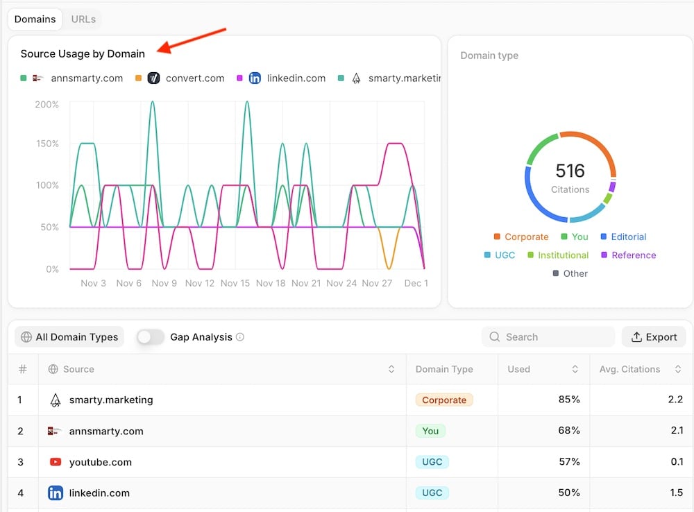 A separate aggregated report combines all genAI platforms, with URL filters for each one. The “Gap analysis” lists cited URLs that mention competing brands but not yours.