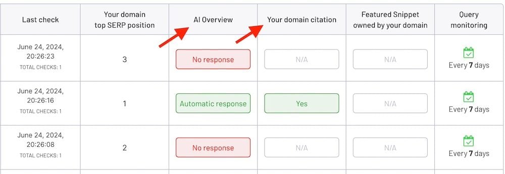 - Whether your query triggered an AI Overview and if your page was referenced.