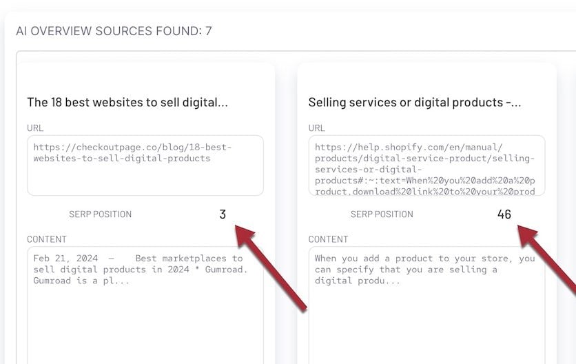 Click any query to see which URLs are included in the AI Overview and where they rank organically. Click image to enlarge.