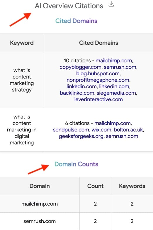 The “AI Overview Citations” report includes all the URLs referenced in each Overview and how often each domain appeared for all queries. This feature was handy for identifying domains referenced from multiple Overviews for my important queries. The report is downloadable as an Excel file.