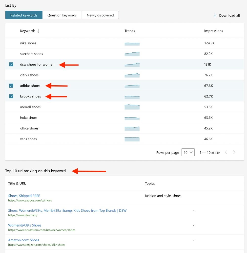 Bing’s “impressions” is similar to Google’s “search volume” — an estimate of how many times a keyword is searched. This example is for the keyword “sneakers.” Click image to enlarge.
