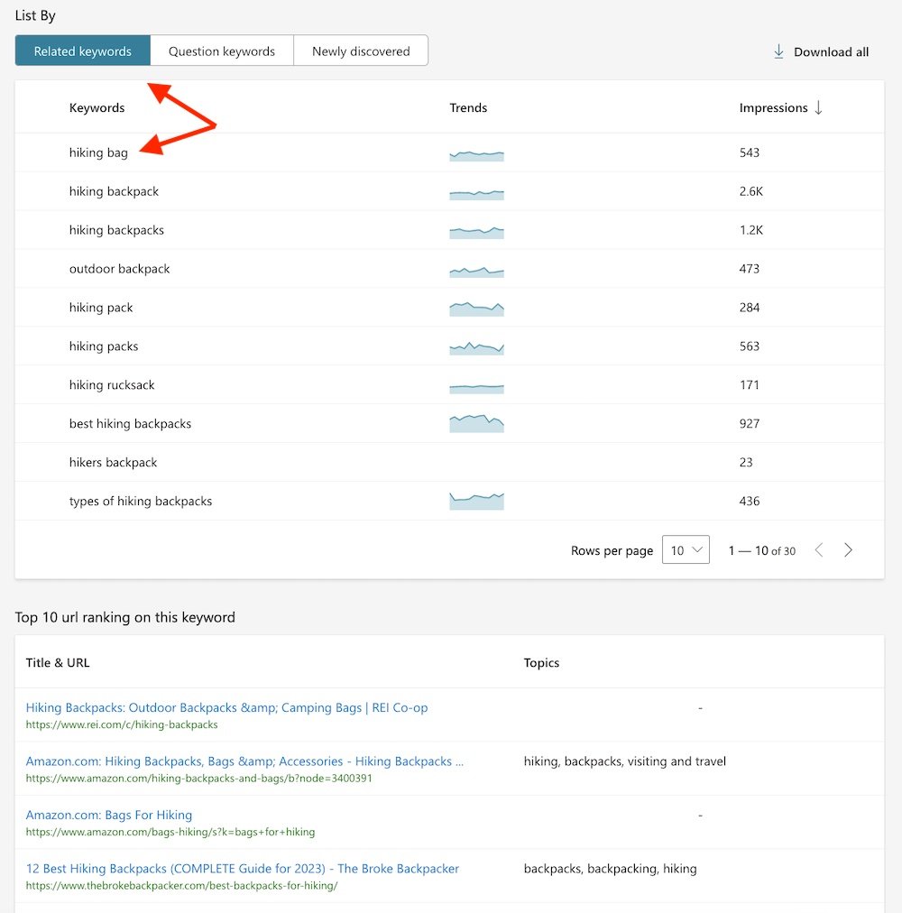 To use the tool, enter your primary term, as shown in the screenshot below. Then click any keyword to see its long-tail versions. You can sort the chart by “impressions,” which represents search volume. Below the chart are Bing’s top 10 ranking URLs for that search query. You can also select and export keywords as a CSV file.
