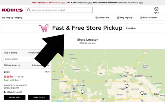 Kohl’s incentives are not limited to discounts. The store locator also emphasizes speed.
