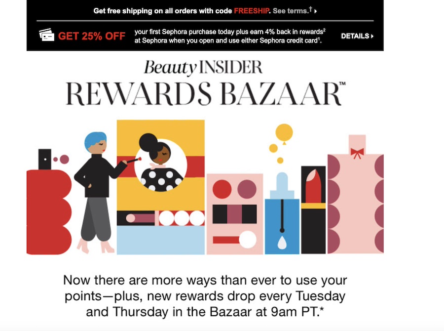 Sephora’s Beauty Insider program encourages purchases and aspiration via tiered perks, birthday gifts, and exclusive experiences. Click image to enlarge.